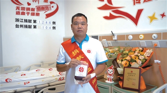 8月11日上午,台州某医院的造血干细胞采集室内,两束鲜花和两封感谢信被摆到了捐献者马东方的床头。经过5个多小时的采集,他成功捐献了217毫升造血干细胞混悬液,这份“生命火种”将为一名血液病患者点亮重生的曙光。马东方由此成为温岭第24例、台州第104例、浙江第1246例无偿造血干细胞捐献者。