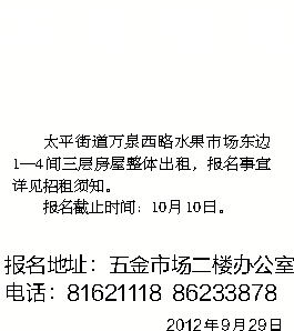 太平街道万泉西路水果市场东边1—4间三层房屋整体出租,报名事宜详见招租须知。