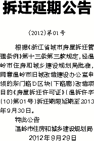 根据《浙江省城市房屋拆迁管理条例》第十三条第三款规定,经温岭市住房和城乡建设规划局批准,同意温岭市旧城改造建设办公室申领的东门路D区块(下路廊)改造项目的《房屋拆迁许可证》(温拆许字(10)第01号)拆迁期限延期至2013年9月30日。