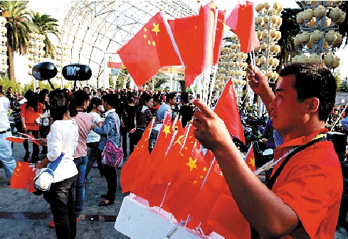 10月1日,市区锦屏公园门口,来自河南省周口市的王先生高兴地摇动着手中的小红旗。