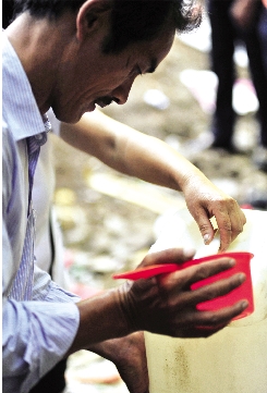 | 接到“神水”的市民将水倒入水桶,继续接水。 |