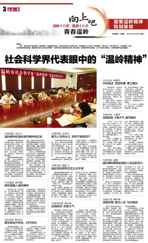 近日,我市举行社会科学界“温岭精神”征集提炼座谈会,来自社科界各个单位的代表,纷纷就自己心目中的“温岭精神”各抒己见。许多代表认为,“温岭精神”应该结合温岭的地理位置,涵盖海洋的文化以及石头的硬气,也有代表认为应该突出温岭人勇立潮头、敢闯敢为的创业精神,以下为代表们的发言,本报特摘登节选以飨读者。