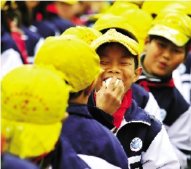 | 城东民工子弟学校的学生们正在食用市青年志愿者为他们募集的鸡蛋。 |