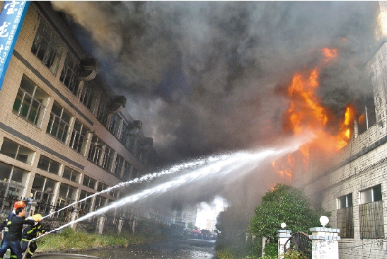 本报讯(记者朱海伟 通讯员金云国 彭军伟文/图)昨天上午5时50分,温峤莞渭童村的浙江万嘉鞋业有限公司三楼厂房突然起火。由于厂房内堆满了鞋料、胶水等易燃物品,火势迅速蔓延至二楼成品和半成品车间,导致10间三层厂房均被熊熊大火吞没。