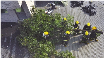 消防官兵正在将阻碍救火的树木锯掉搬走。