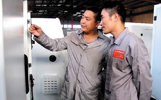 | 林银方(左)正在指导员工,如何操作机床。 |