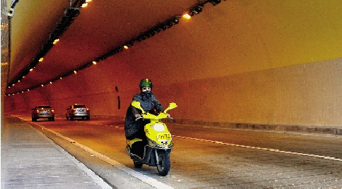 | 一辆助力车逆向行驶在一级公路隧道里。 本报记者 朱海伟摄 |