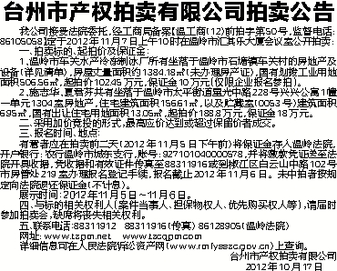 我公司接受法院委托,经工商局备案【温工商(12)前拍字第50号,监督电话:86105058】定于2012年11月7日上午10时在温岭市汇其乐大厦会议室公开拍卖: