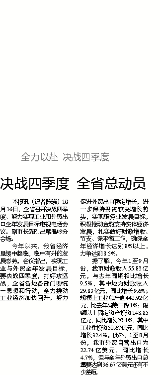 今年以来,我省经济呈缓中趋稳,稳中有升的发展态势。会议指出,实现工业与外贸全年发展目标,要决战四季度,打好攻坚战,全省各地各部门要统一思想和行动,全力推动工业经济加快回升,努力促进外贸出口稳定增长,进一步保持投资较快增长势头,实现服务业发展目标,积极推动金融支持实体经济发展,扎实做好财政增收、节支、保平衡工作,确保全年经济增长达到8%以上,力争达到8.5%。
