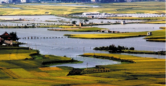 我们选取了其中的一张作为“每周一图”,这幅图片前景是金黄的稻田,画面中间是富有水乡特色的石桥,远处,水面与稻田互相交融在一起。画面的前景、中景、远景分明,还有石桥、房屋点缀其中,丰富了画面的内容,构图十分老到。