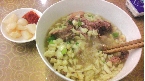 羊肉泡馍:待到馍碎成接近“米立方”时,锅起下汤,羊肉入味,葱末、生菜附上