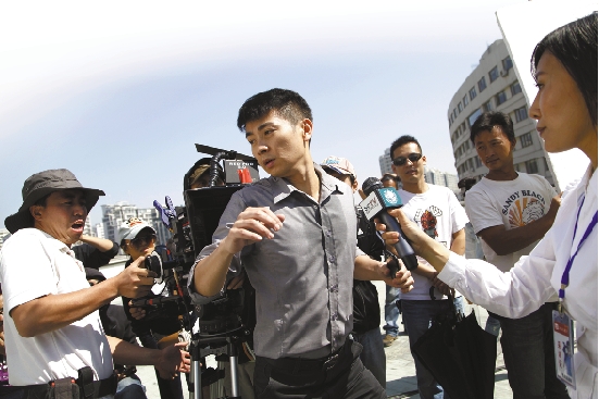 | 保剑锋在躲避记者(群众演员)的采访时,不小心碰到了摄像机。 |