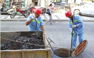 10月21日上午,市政养护队的队员在南屏小区门口清理窨井中的砂石等垃圾,仅在南屏小区南大门口边上的一个窨井中,工作人员就清理出相当多的垃圾。 本报记者 黄晓慧摄