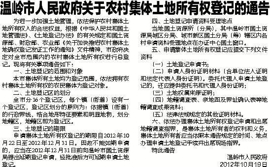 温岭市人民政府关于农村集体土地所有权登记的通告