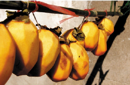 田舍-夏时进:以前农村都是成片成片晒柿子的,现在城区没那么大块的地,想出这么一个晒柿饼的方法,很有意思。这样用细线把柿子穿起来,放阳光下暴晒自然风干,三五天后就柔软起来,成品以后风味独特。