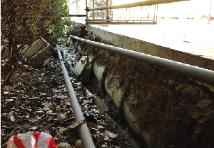 停车位是水泥地,水泥地到围墙之间有一块泥地,种着绿化植物。空车位附近的泥地,已经沉降下去,有部分围墙已经倒塌。