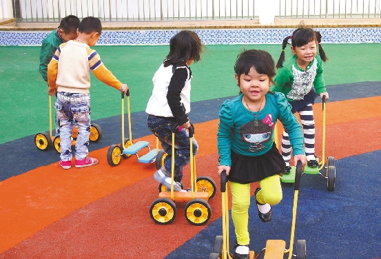| 城南中心幼儿园的小朋友在七彩操场上玩滑轮。 |