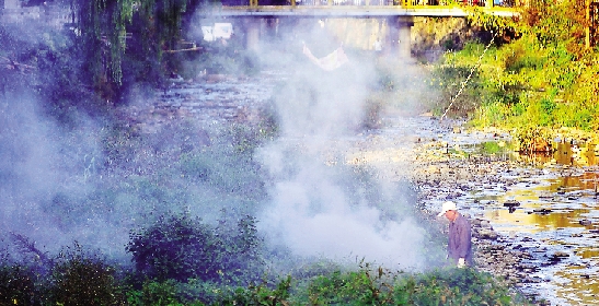前天下午,一位市民正在前溪焚烧杂草,产生了大量呛鼻刺眼的浓烟,导致沿岸前溪路段被浓烟笼罩,不仅影响了环境,也给前溪的交通带来了不便。 本报记者 朱海伟摄