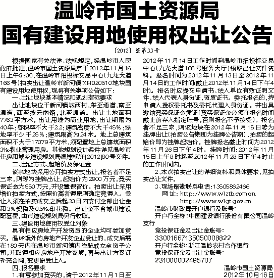 根据国家有关法律、法规规定,经温岭市人民政府批准,温岭市国土资源局定于2012年11月16日上午9:00,在温岭市招投标交易中心(九龙大道166号)拍卖出让温岭市新河镇XH020510地块国有建设用地使用权,现将有关事项公告如下: