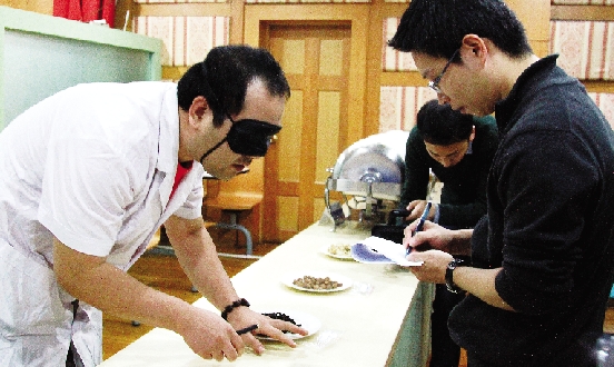 | 蒙上眼睛,看谁能辨出药材 温岭中医院举行中医药技能大比武 蒙上眼睛,只可用手摸、鼻闻、口尝方法鉴别,辨认出薄荷、黄连、制黄精、当归、砂仁等五味中药材。这是10月24日晚温岭市中医院举行中医药技能大比武活动中的中药饮片鉴别技能竞赛中的题目之一,这题目还真考倒了不少人。当晚的比赛还包括中药饮片调剂技能比赛(俗称捉中药),一张中药片15味中药,捉5帖药,其程序包括回斗、摆药、核对等。 本报记者 黄晓慧摄 |
