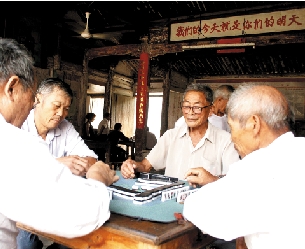 祠堂改成的老年活动室里,几位老人们正在搓麻将,墙上写着“我们的今天就是你们的明天”。
