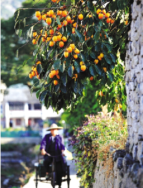 一位老农骑着三轮车从果实累累的柿子树下经过。金秋十月,城东街道肖溪村的一些房前院内,满树黄澄澄的柿子给山村的秋天增添了绚丽的色彩。