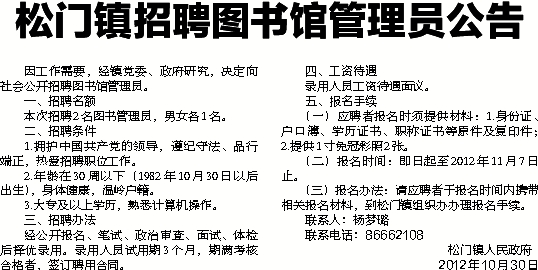 因工作需要,经镇党委、政府研究,决定向社会公开招聘图书馆管理员。