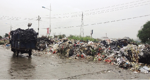 记者在一旁看到,不断有人骑着三轮车来将边角料等垃圾拉到这里。“前段时间,路上的垃圾没这么多,最近才多起来的,听说是运不出去。”一位倒垃圾的男子说。