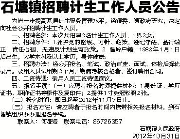 (三)报名方法:请应聘者于报名时间内携带相关报名材料,到石塘镇组织办办理报名手续。