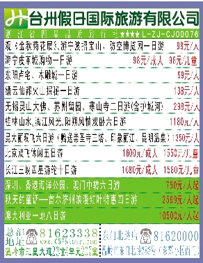 ■总部地址:市区温岭大厦B单元一楼 联系电话:86115701 86198339(散客) 86198337 86144330(团队)