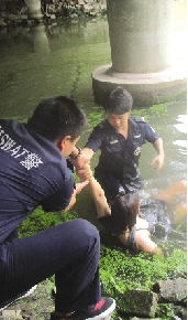 林警官和协警小夏跑到桥下,二话不说就跳入河中向落水女子游去。林警官由于用力过猛,头撞到桥顶鲜血直流。
