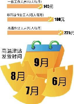 近日,省总工会下发《关于认真做好夏季劳动保护和防暑降温工作的通知》,明确今年高温津贴发放标准与去年相同,高温作业工人每人每月225元,非高温作业工人每人每月180元,一般工作人员每人每月145元。发放时间为6月、7月、8月、9月。