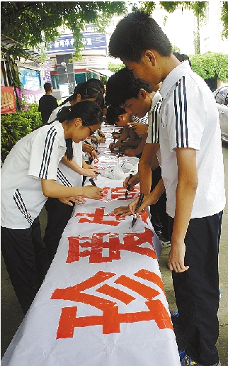 响应“防溺水”,岙环中学学生纷纷在横幅上签字。