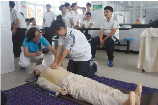 “心肺复苏适用于呼吸、心跳骤停的伤病员,前4分钟是抢救生命的黄金时间。”6月25日,城南镇岙环中学邀请市红十字会救护师来校作应急救护培训,介绍溺水、中暑、受伤等应急知识,以及心肺复苏的理论和基本操作技能。