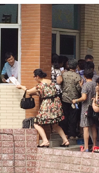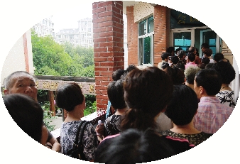 报名室门口的走廊围栏很浅,有些心急的学员站到了围栏上面张望室内的情况。一位泽国来的老先生直嚷道:“住在乡下太吃亏了,城里的比我近多了。”