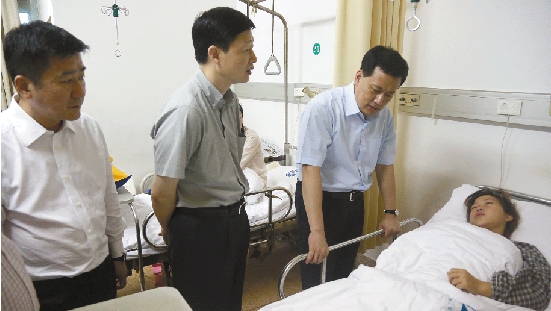 ▶7月5日下午,省委常委、常务副省长袁家军(左三)在台州市委书记吴蔚荣(左二)、市长张兵,我市市委书记徐淼(左一)等台州市、温岭市领导陪同下,专程到市一院,看望慰问收治在此的受伤者。 本报记者 黄晓慧摄
