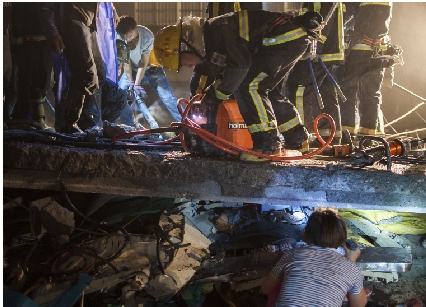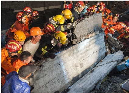 搜救人员齐心协力将空心板抬掉,方便进一步救援。