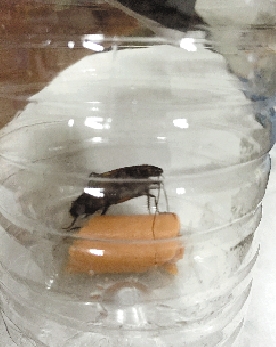 将“蟑螂神器”放在蟑螂经常聚集的地方。经过一个小时左右,发现瓶子里果真有一只,它一直努力往上爬,幸好小记在报纸与瓶口连接处用胶布粘上了,否则它很容易从缝隙里逃脱。