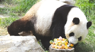 图中大熊猫“心心”正在澳门石排湾郊野公园大熊猫馆里享用“生日蛋糕”。