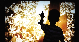 在“七七事变”纪念日到来之际,众多游客来到哈尔滨东北烈士纪念馆参观,接受爱国主义教育。图为一个孩子正在观看抗战影片。