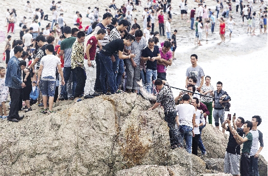 东海塘内,一游客捕上了一条十几斤的大鱼,引来了围观。