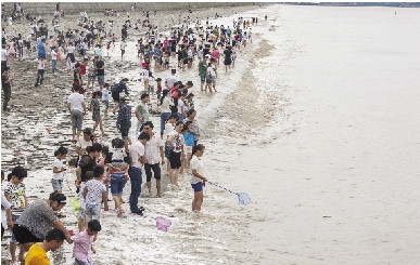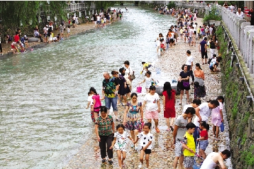 | 台风带来的强降雨使前溪水位大幅上涨。这两天,众多市民带着小孩来到前溪涉水漫步道嬉水玩耍,抓鱼捕虾,感受台风带来的意外惊喜和快乐。 本报记者 刘振清摄 |