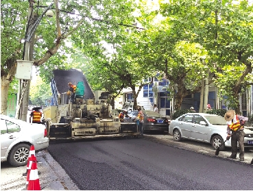 | 市政工人正对虎山路上的破损路面进行修补。 |