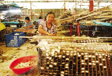 不像以前,如今除了冬季,春、夏、秋三季都能养蚕,一般一批蚕从小到大要20多天时间。蚕到了吐丝的时候,就会自己爬上纸板方格簇,一个方格卧一只蚕,开始结蚕茧,此后,将蚕茧摘下就可以销售。“今年每批蚕产的蚕丝达到6000多斤。”郭标送的妻子告诉记者,不过,由于今年全省各地的蚕丝产量都有所提高,因此价格从去年的每斤22元至24元,降到了如今的20元一斤。“而且随着人工成本的提高,今年养蚕的成本也明显比去年的高了很多。不过,市场需求量还可以,所以我们不担心卖不出去。”