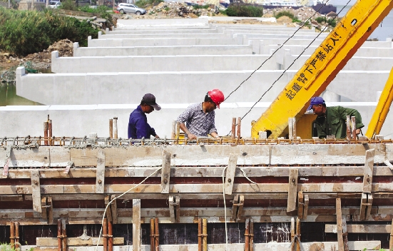 7月14日,施工人员正在浇筑石板殿大桥桥墩。石板殿大桥是81省道改建温岭段最后一座大桥,是接近81省道终点的一项控制性工程。在81省道温岭段改建工程百日会战中,施工队克服作业地段交通不便等困难,科学安排施工时间,有序推进桥墩浇筑。 本报记者 刘振清摄 |