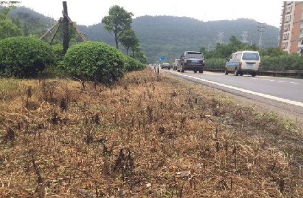 | 从康惠佳园到楼山隧道口的这段绿化带都枯死了。 本报记者 庞辉斌摄 |