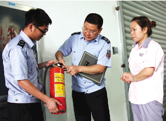 7月14日,在新河镇的一家纺织企业里,安监检查人员正对灭火器进行检查。近来,新河镇组织机关干部、安监、消防人员,对全镇的2780多家企业存在消防、违建等问题进行地毯式检查,以消除各类安全隐患。 本报摄影师 林绍禹摄