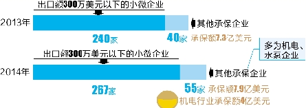 不只是报损的增多,投保的企业也开始增多。2013年,我市承保的出口额300万美元以下的小微企业有240家,去年增加到267家,承保额达2.5亿美元;其他承保企业2013年有40家,承保额达7.3亿美元,2014年增加到55家,承保额达7.9亿美元。这其中,承保的多为机电、水泵企业。去年机电行业的承保额就有4亿美元,占全年总承保额的一半以上。