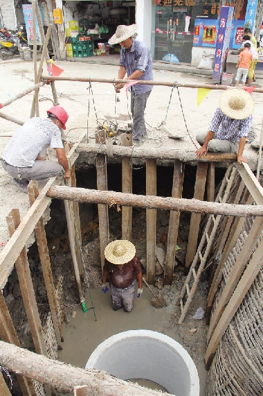 7月20日下午,松门镇松寨村,施工人员正在铺设污水管网。