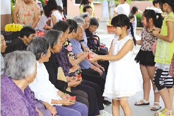 7月22日上午,市第八中学暑期社会实践小分队和城北街道“候鸟班”的小朋友一起,带着新鲜水果以及自己精心编排的节目,来到城北金色夕阳敬老院,看望居住在这里的100多位老人。在送清凉的同时,小朋友们还给老人们献上歌舞表演节目,给老人们带来了贴心的温暖。 本报通讯员 梁伟伟摄